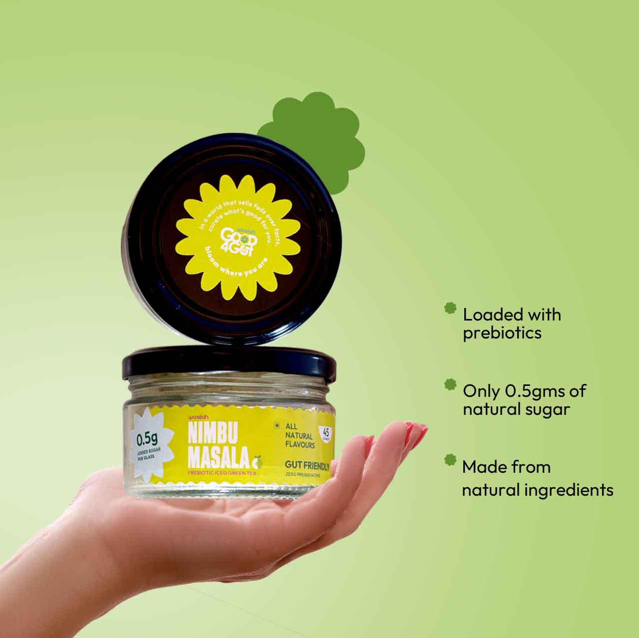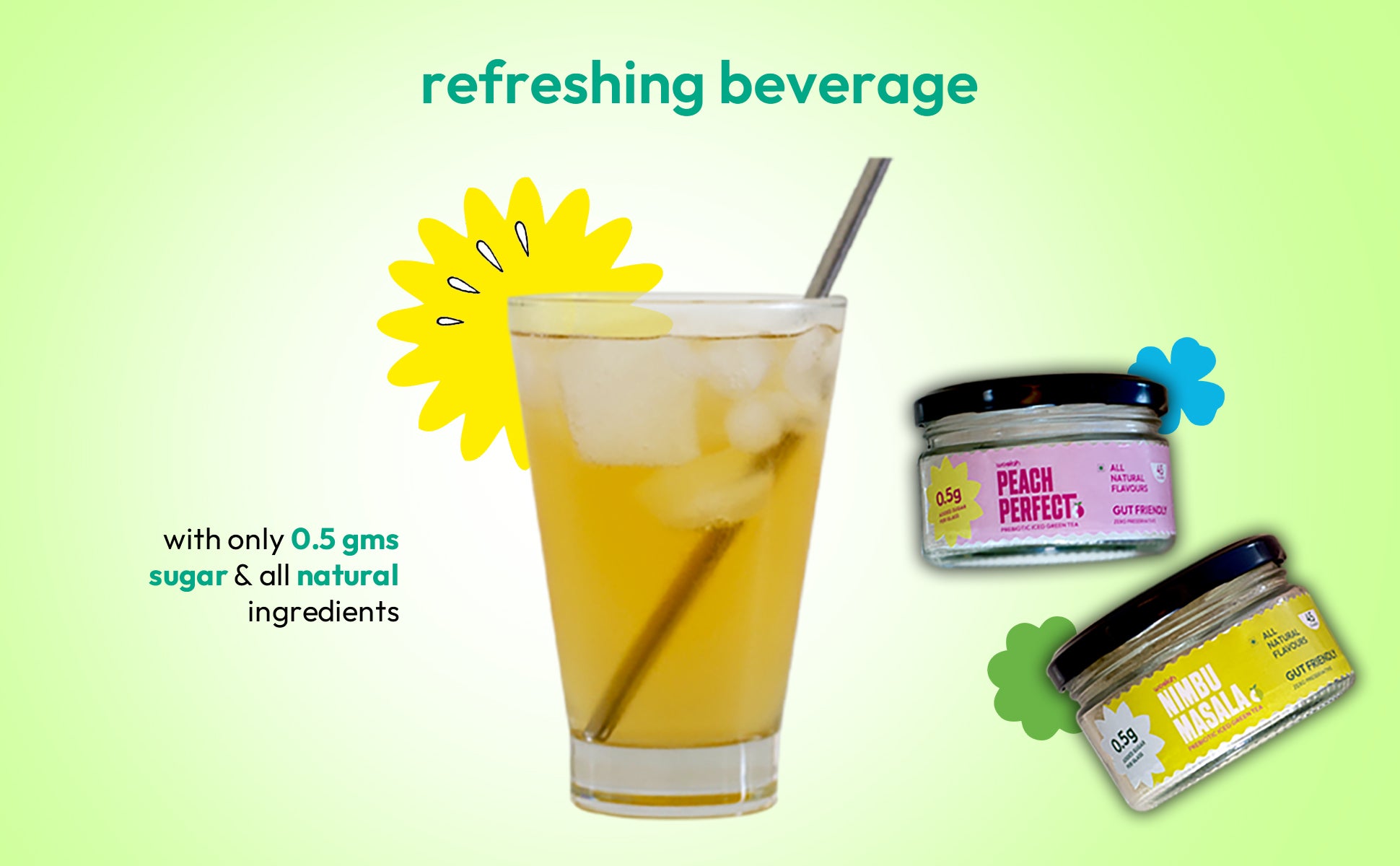 The Legendary Nimbu Masala Prebiotic Iced Tea with only 0.5 gms of Sugar (Jaggery) & all natural ingredients.