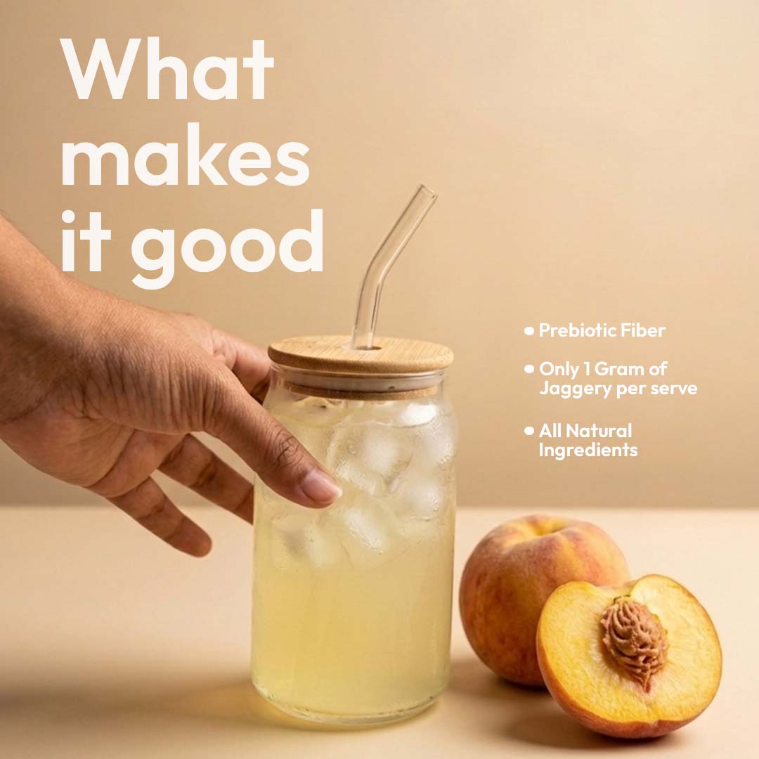 Prebiotic Green Tea Peach Iced Tea with only 1 gram of Sugar (Jaggery) & all natural ingredients.