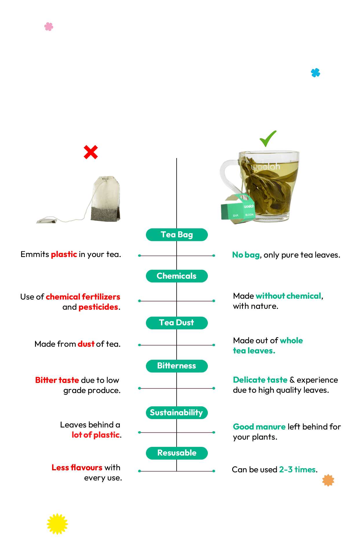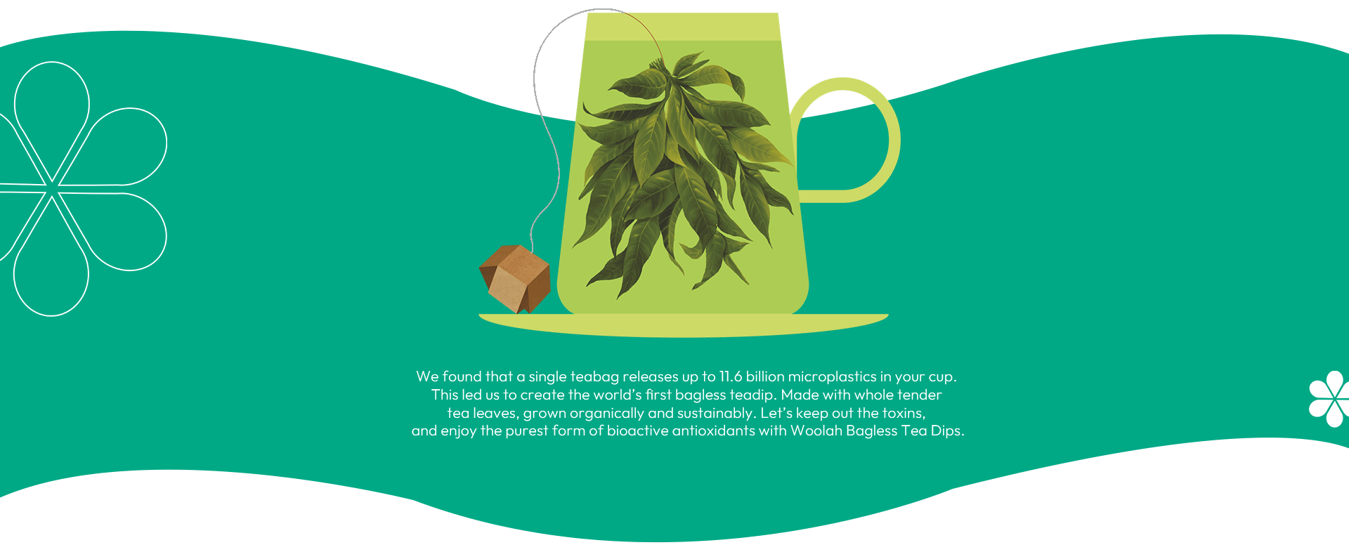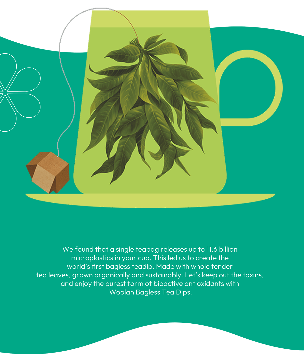 Tea bags contain microplastics that seep into your brew. Woolah’s bagless dip eliminates this risk.